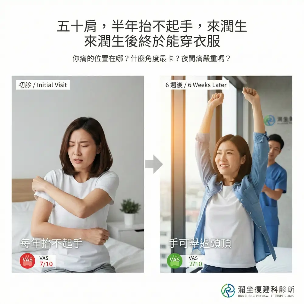 五十肩典型症狀:抬手痠 → 穿衣痛 → 夜間痛醒最折磨 為什麼五十肩晚上特別痛?翻身、側睡就會痛醒 但最恐怖的 […]